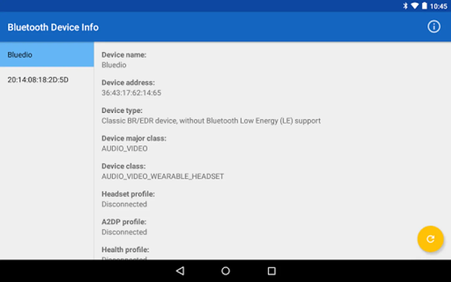 Bluetooth Device Info - is a simple app that shows your Bluetooth device's properties. You can easily copy devices name or address by tapping on it. Also, you can find out whether your device supports Bluetooth Low Energy (LE).