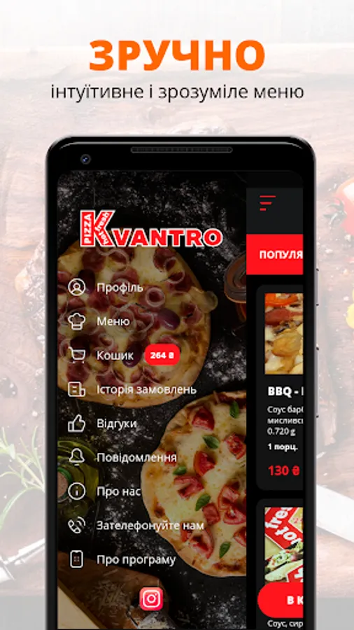 The main activity of the company "Kvantro Pizza" is the production and delivery of pizza, baked chicken, as well as other hot dishes, salads, drinks to home or office. Pizza is delivered in special heat-insulating bags, which allows you to keep it hotter and fresher.