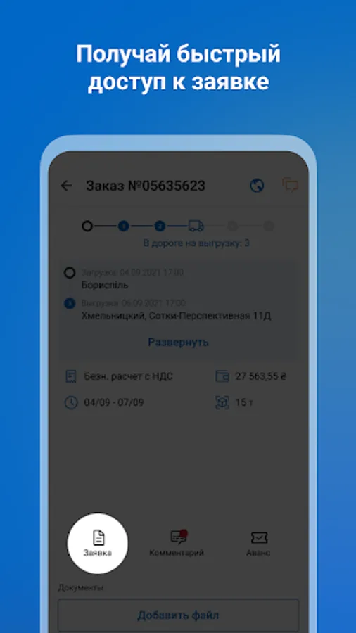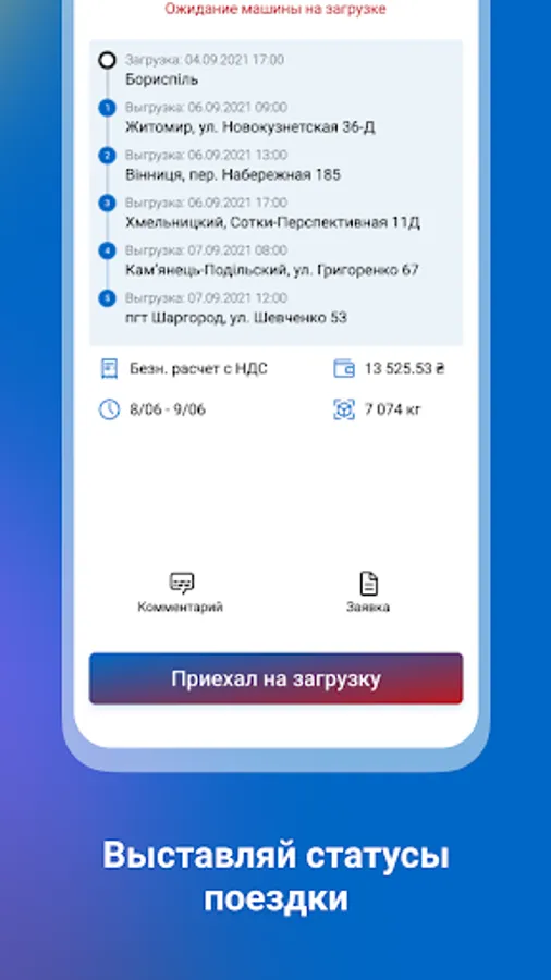 Change the transaction status upon arrival for loading, completion of loading and unloading. At the end, attach the relevant documents to the card on which you want to receive payment. You can attach documents using the saved documents on your phone, as well as the document scanner inside the application - just put the document and click scan.