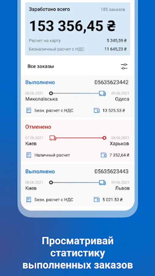 Set the status of the trip and get the calculation for completed orders. View statistics of completed orders and get quick access to orders.