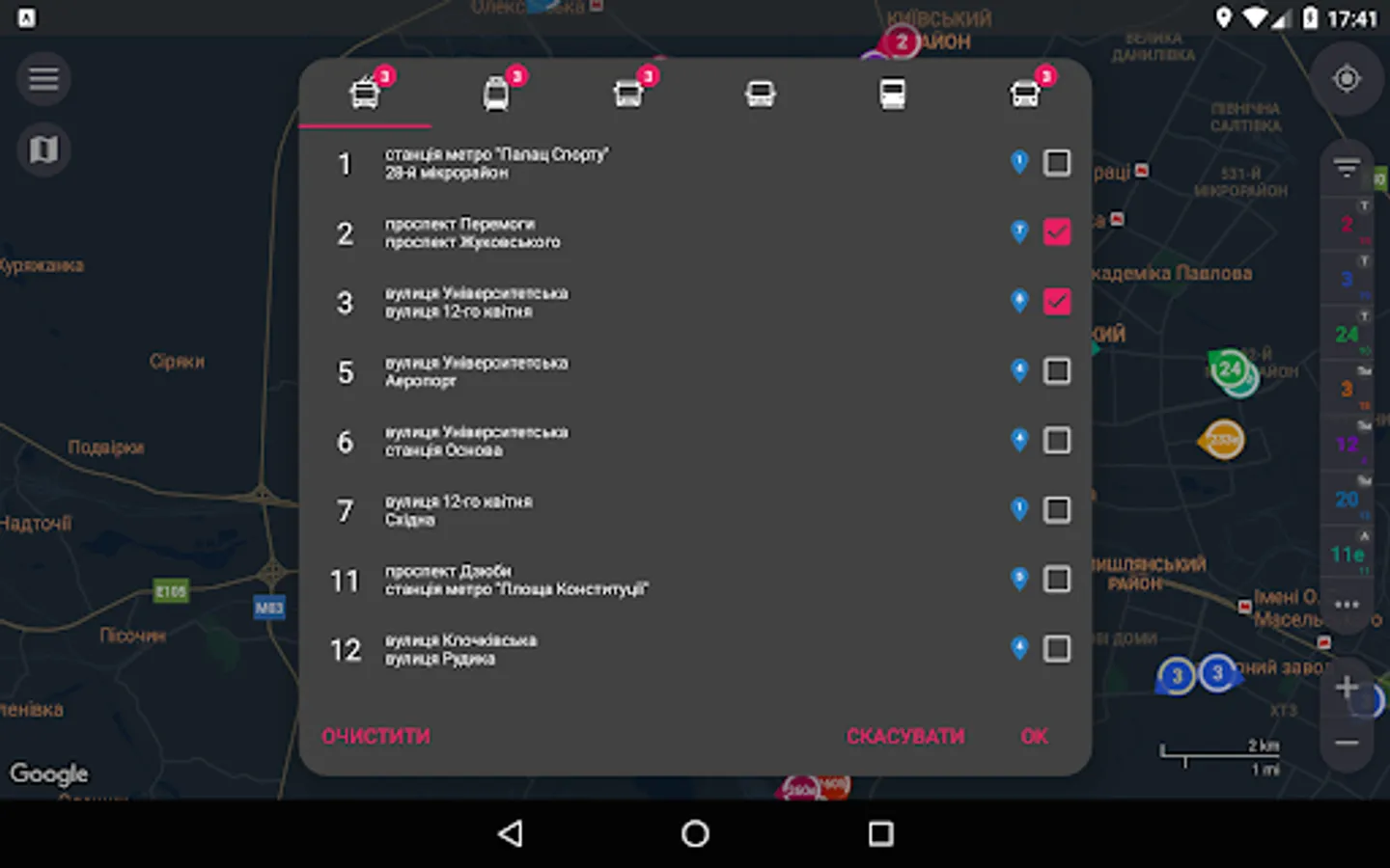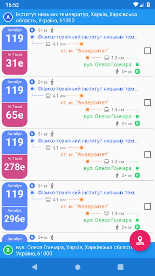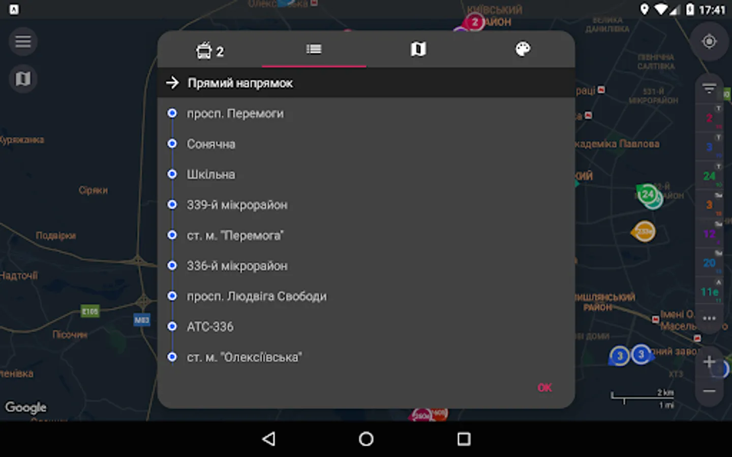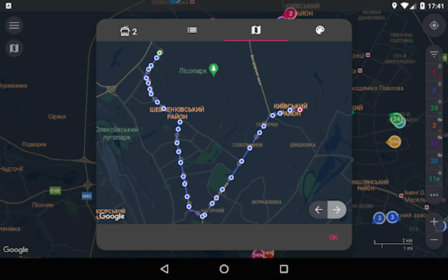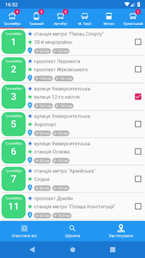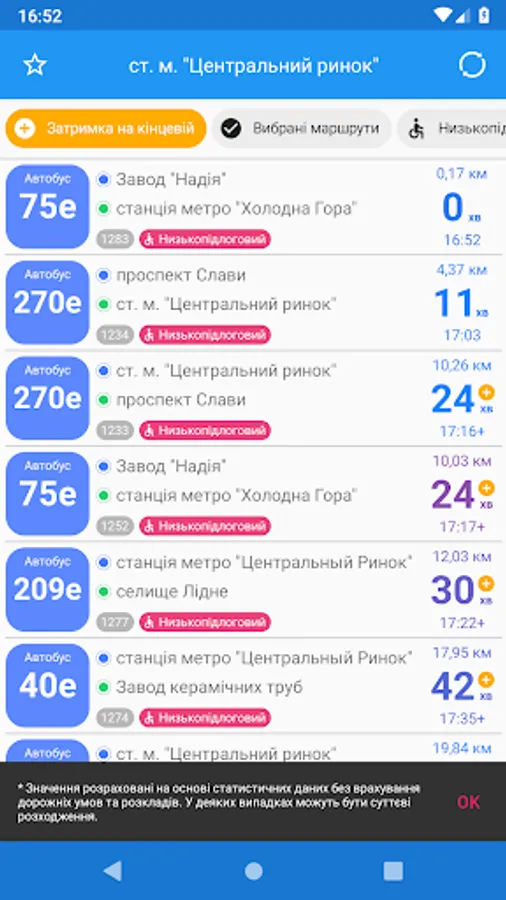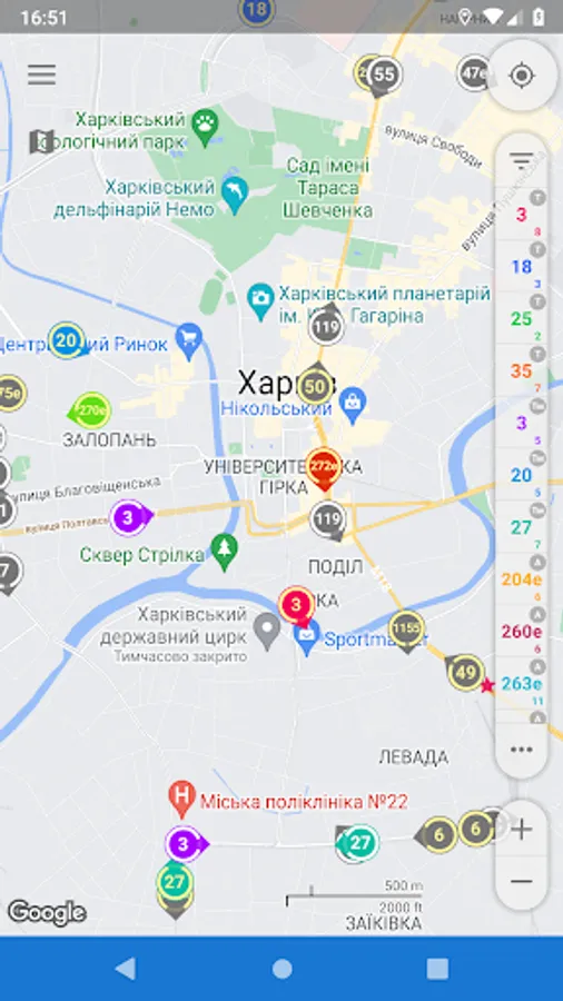 - Color routes identification. Distinguishing routes is quite easy, 'cause every selected route is determined not only by its number, but although by color of its marker.
