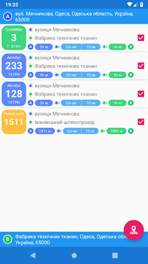 - Color routes identification. Distinguishing routes is quite easy, 'cause every selected route is determined not only by its number, but although by color of its marker.