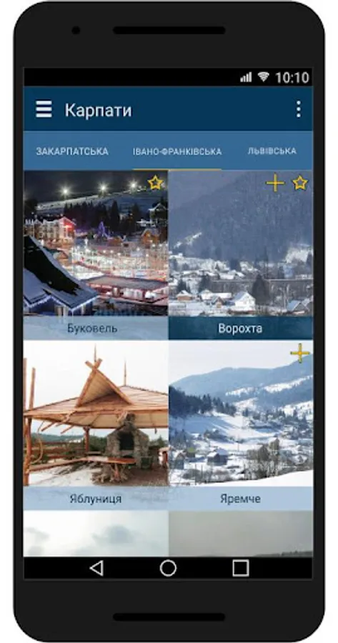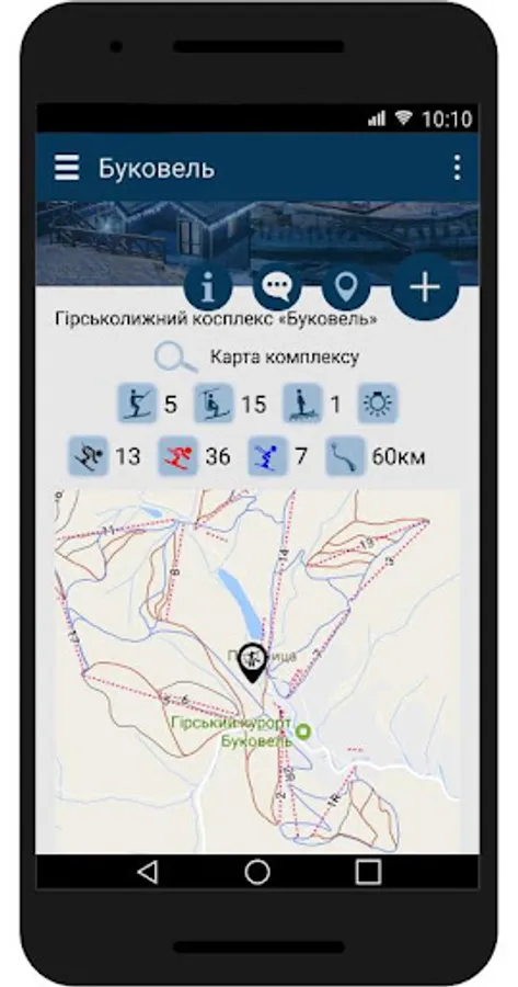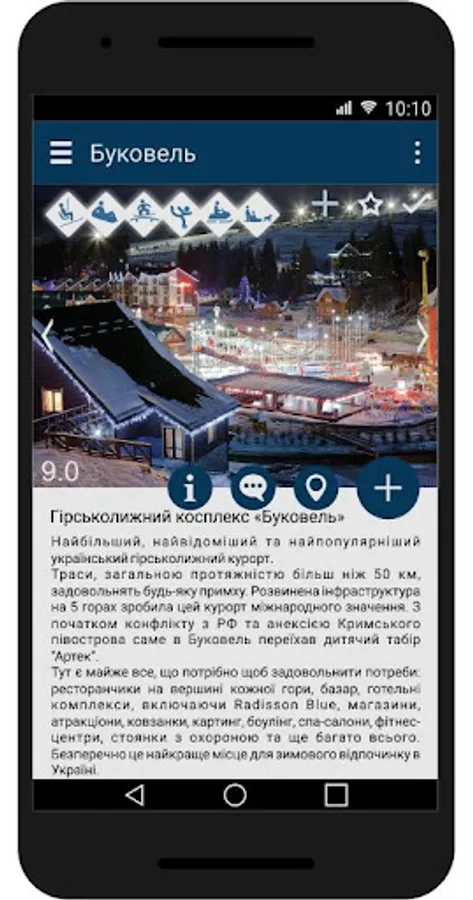The application which gathered information on winter recreation in Ukraine. All information is structured by regions and categories. Here you can discover new places to rest or actively zaynitys sports.
