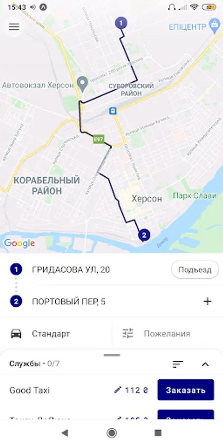 Having indicated the route of the trip, the application will calculate the cost in several services of the city of Kherson at once.