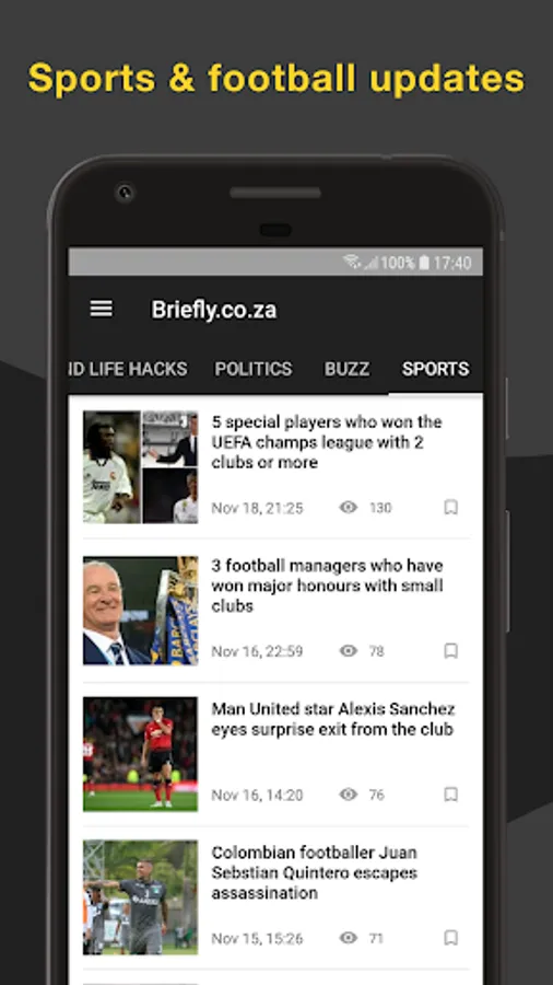 Sports news: read sports section in BRIEFLY news feed to be updated on current international and local sports news/happenings, especially soccer/football and cricket news. Stay on top of Champions league news and share them with friends!