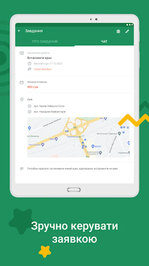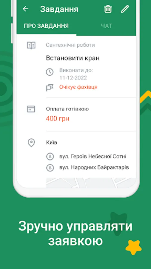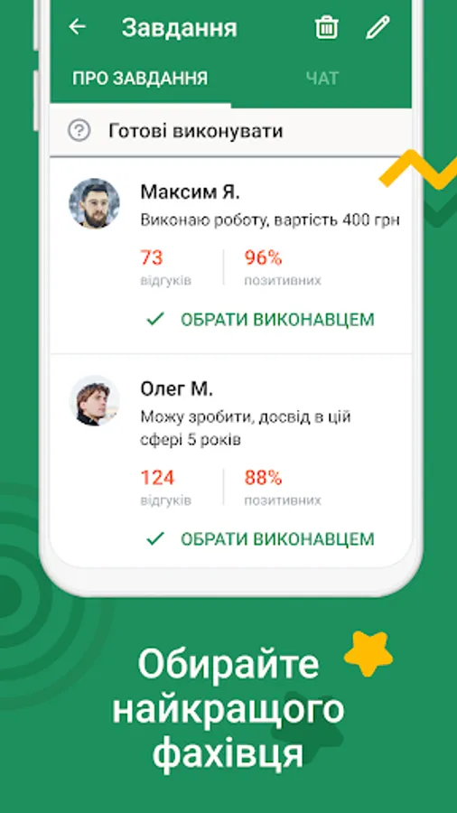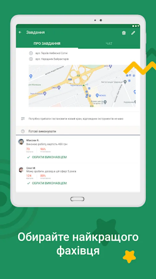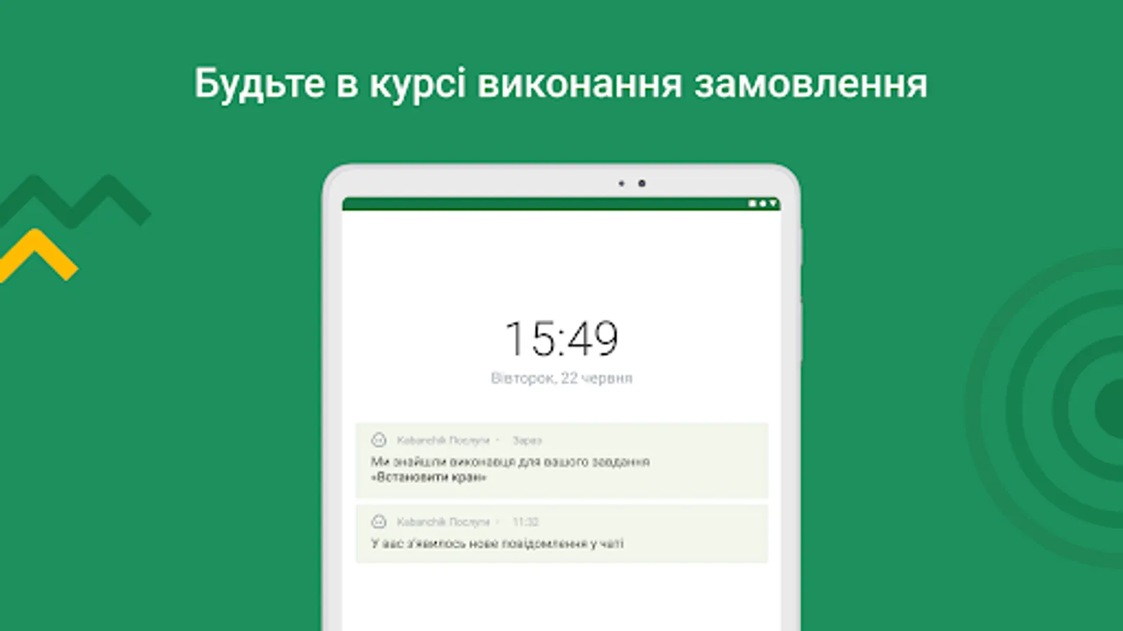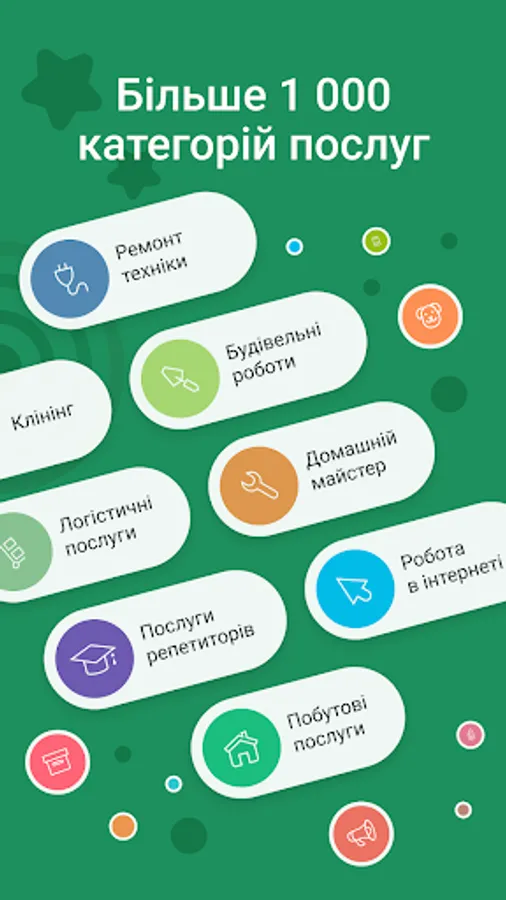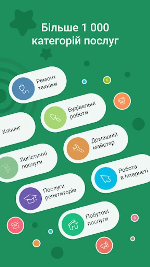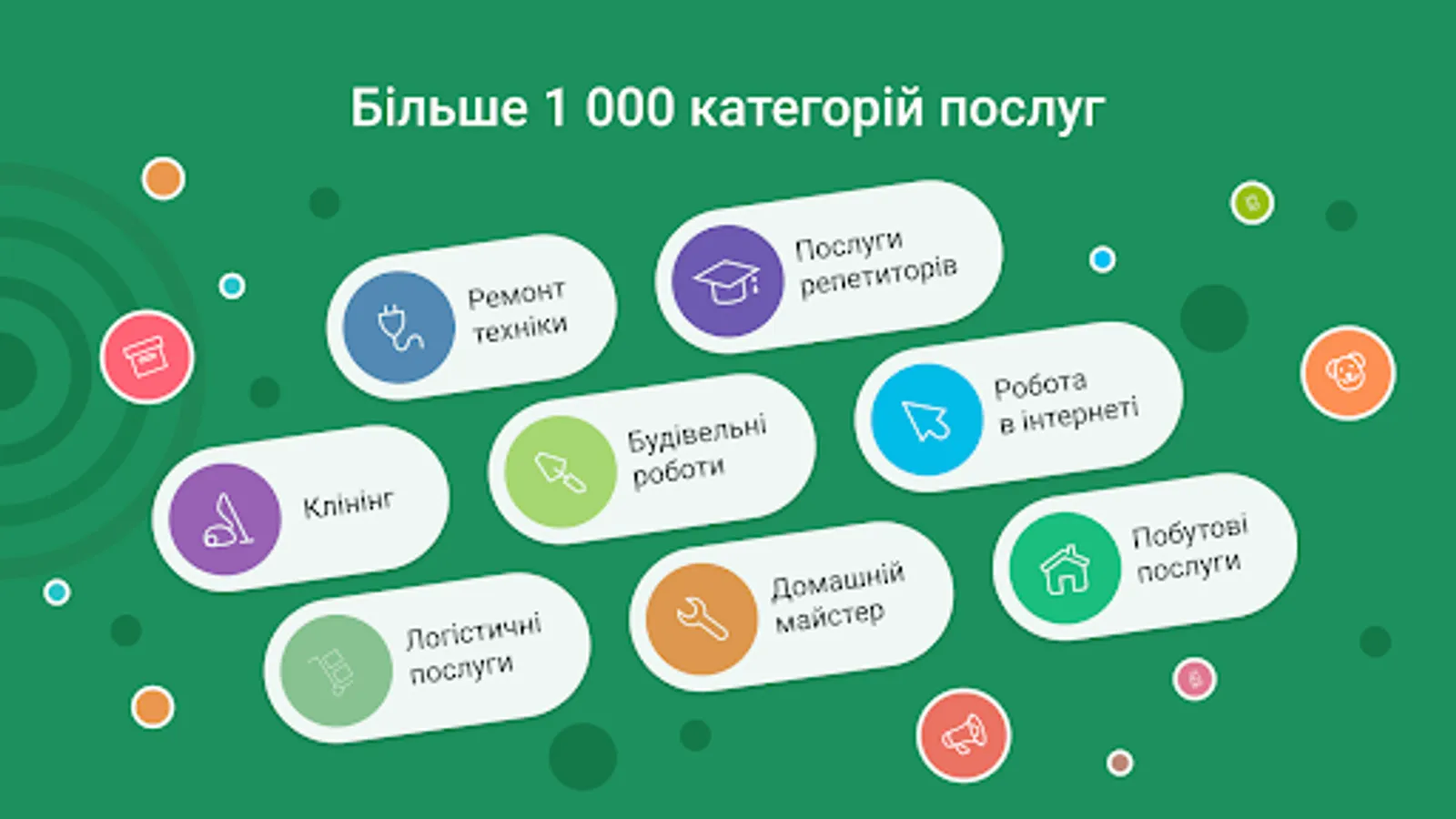 Do you need courier delivery, apartment cleaning, appliance repair or plumbing services? No problem! Install the application and order the necessary service on Kabanchik.ua in one click. These are just a few examples from the categories on Kabanchyk, there are more than 1,000 of them in total! Home handyman, finishing works, household services, freelance, courier services. The list can be continued for a long time, but one thing is important - with the services of our masters, you will solve most of your tasks!