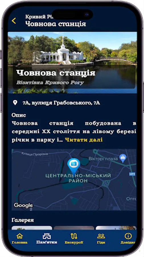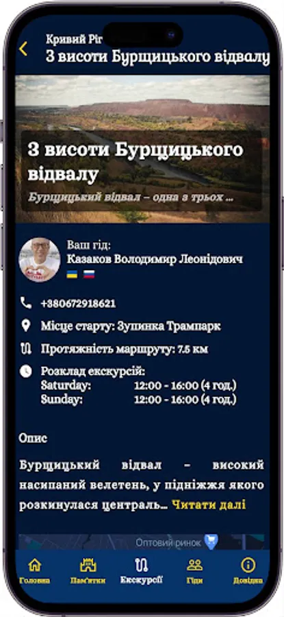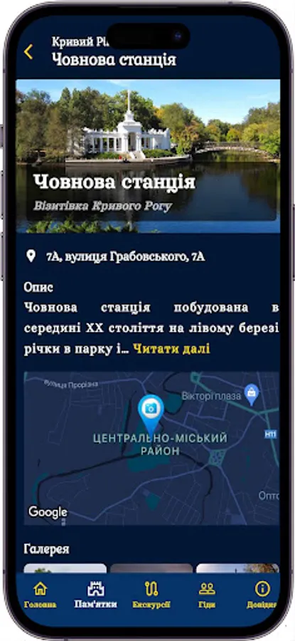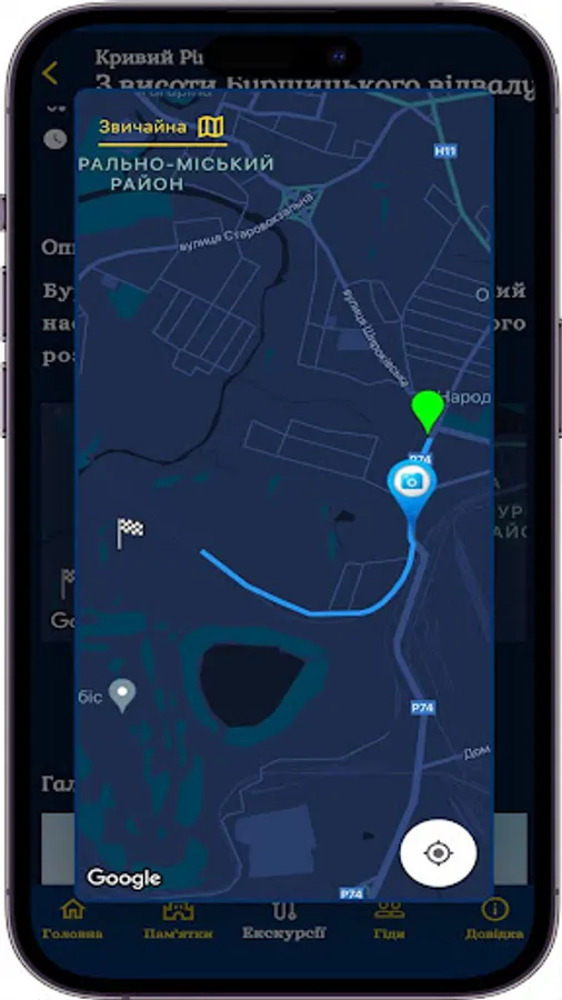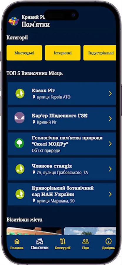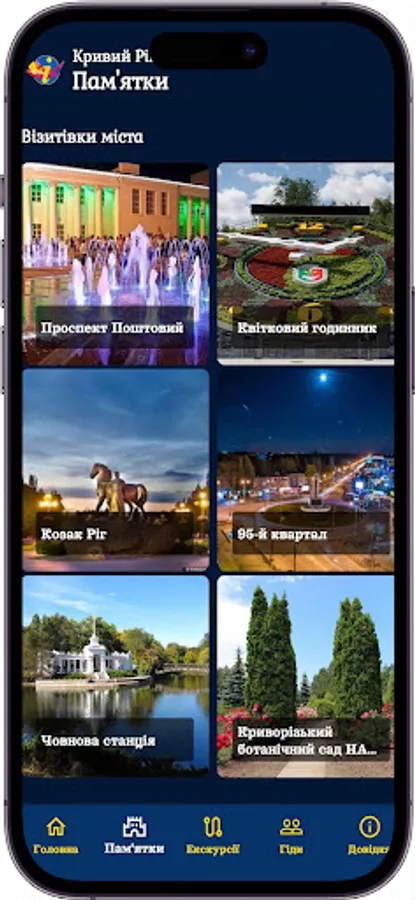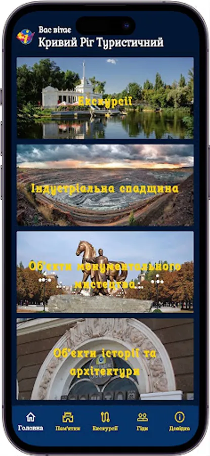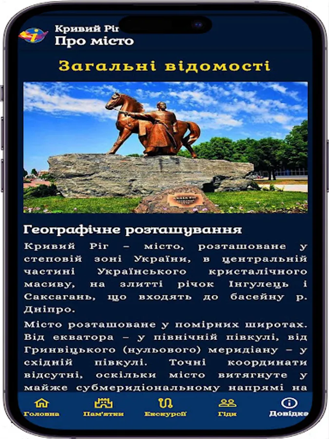 "Kryvyi Rih Tourist" is a mobile application about the "Life-long City", which includes sights, places of interest, guides, excursions and tours of Kryvyi Rih.