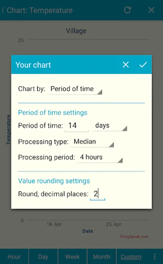 View and customize charts, set up period or results count, average, sum or median the values there.