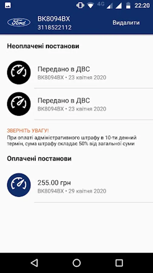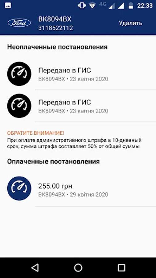 The application allows you to search for resolutions<b> issued for the vehicle, as well as subscribe to receive notifications of new resolutions. Quick receipt of information about the resolutions for your vehicle will allow you to pay<b> it online, while receiving a 50% discount<b> when paying within 10 days of receipt.