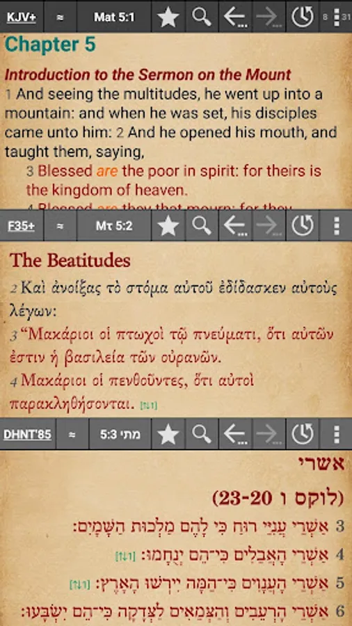 - Two or three Bible windows with different translations; windows that automatically synchronize for the current position, but can also be used independently.