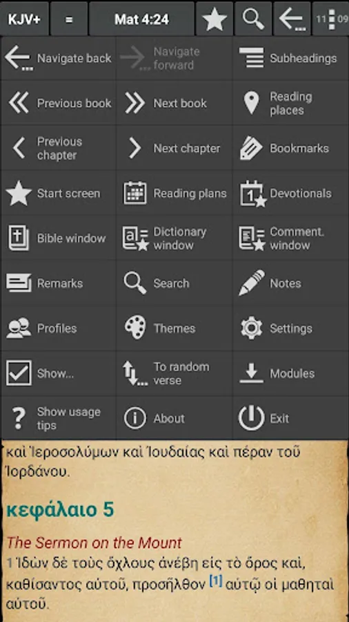 - Adjustable display of the Bible text, all chapters of a book (not just one chapter at a time); grouping of verses into paragraphs, subheadings, with or without verse numbering; highlighting of Jesus' words, night mode.