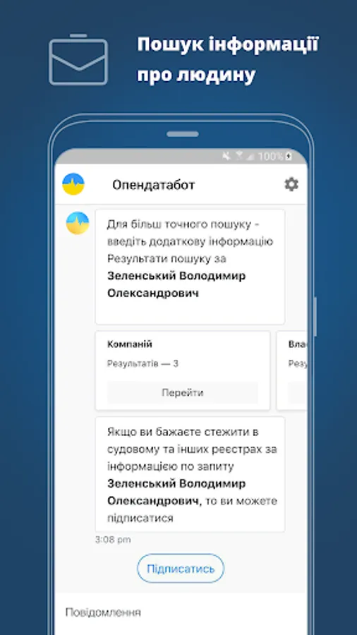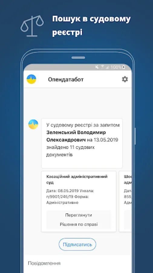 Trial cases and schedules. Opendatabot provides information on court cases based on the number, lawsuits based on a person's or a company’s name, enforcement proceedings. It can check a lawyer's license and track adjudications based on keywords or find out if there is any claim if no written notice has been received.