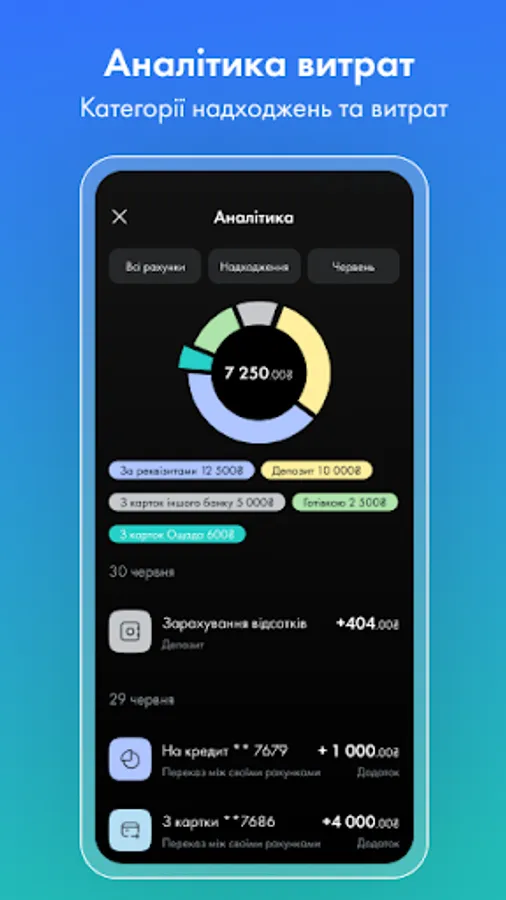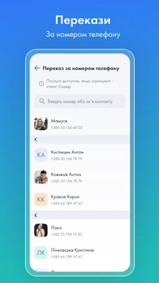 • Money transfers are even more convenient: by phone number, by card number, and when transferring to another bank's card, the logo of the receiving bank is displayed to make sure that the specified card number is correct.