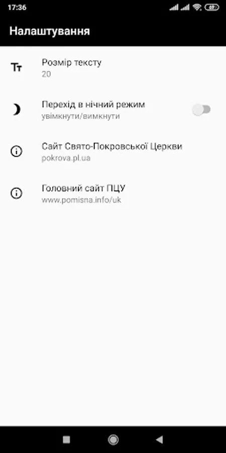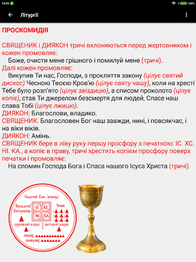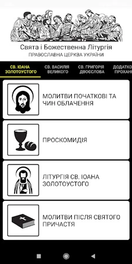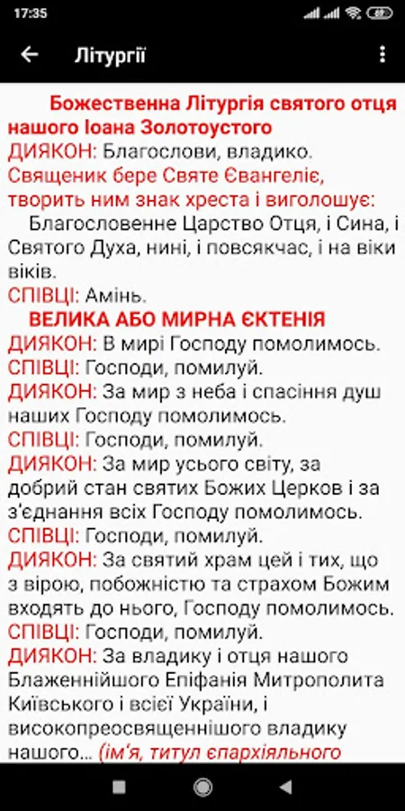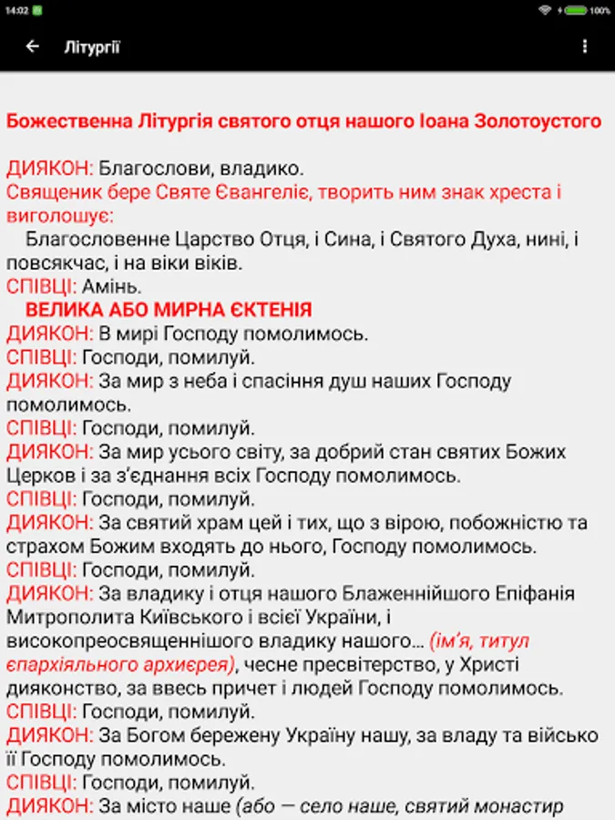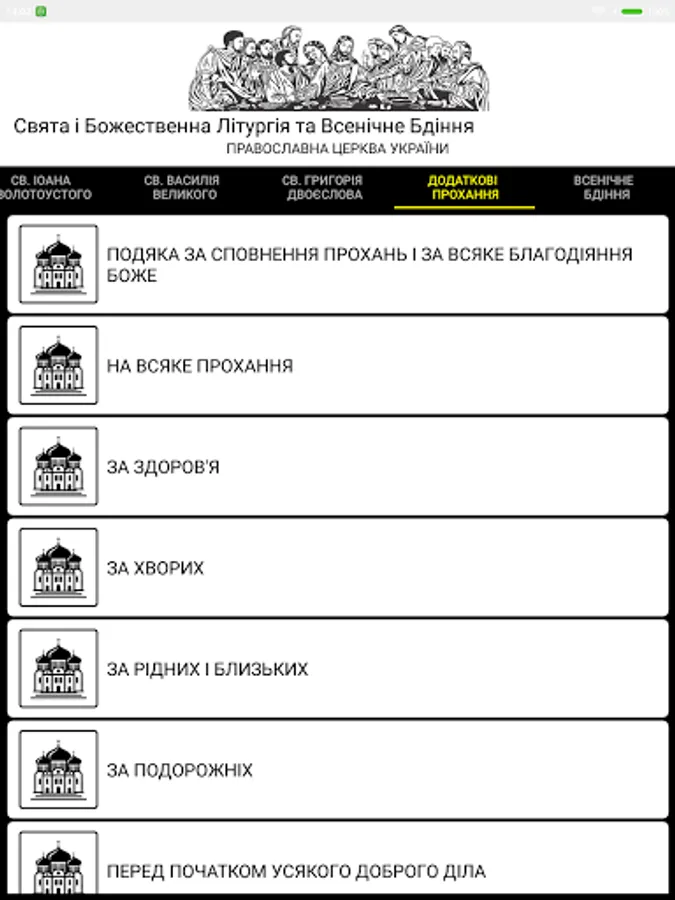 The "Sluzhebenyk" of the UOC-KP publishing house, Kyiv 2012 was taken as a basis. The appendix contains the Holy and Divine Liturgies of St. John Chrysostom, St. Basil the Great and the Presanctified Gifts. There are text size settings, and night mode.