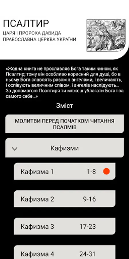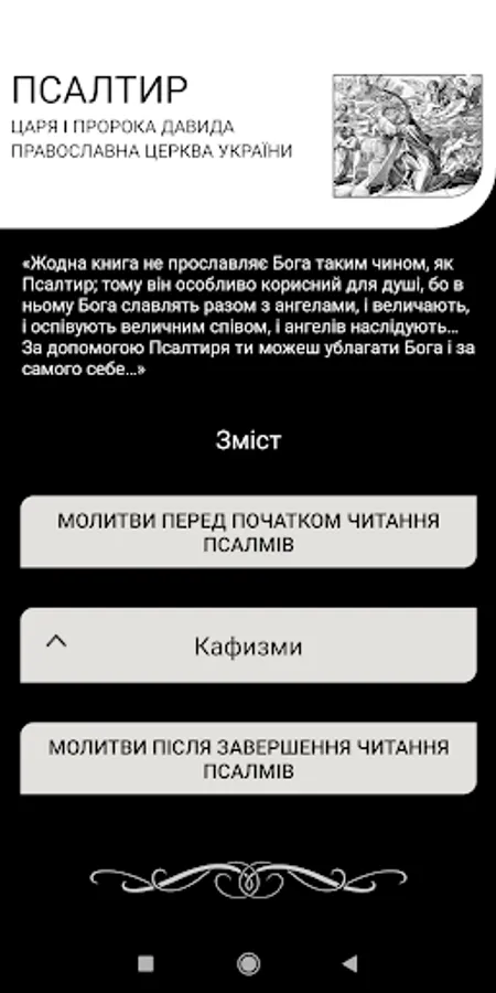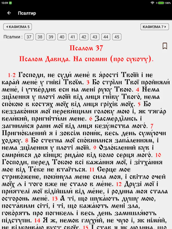 The appendix contains prayers before and after the reading of the psalmist. It is possible to adjust the text size.