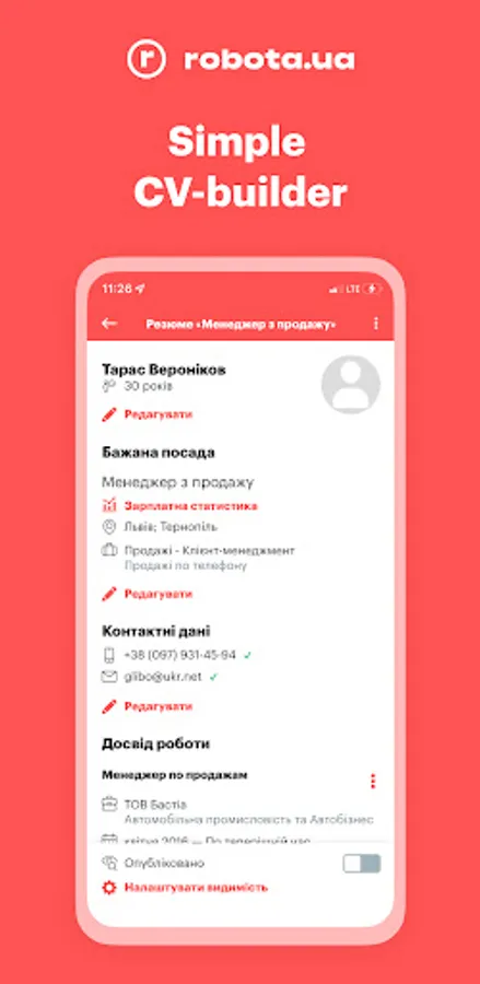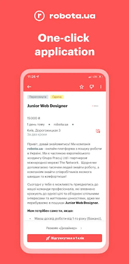 If you have a CV in our base at robota.ua, or, maybe, your own CV-file, you don’t need to spend time to fill in forms. Apply for a job in one-click!