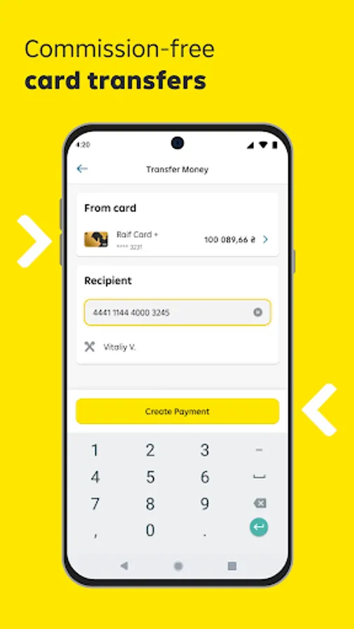 On the Main screen of the application, click on the "Transfer Money" button. Select the debit card from which you want to transfer money and enter the recipient's card number. Create a new transfer and pay the required amount. If the transfer is successful, you will receive a confirmation in the transaction history and transfer details.