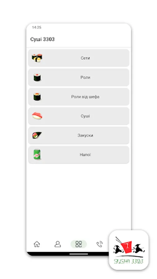 The "Sushi 3303" application allows you to familiarize yourself with the assortment of our company and make an order very quickly. Convenient design will not allow you to get confused in the large number of functions presented in the application.
