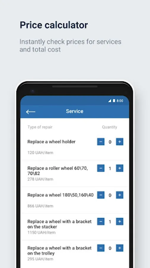 The calculator built into the application will help the user to independently calculate the cost of equipment or its repair.