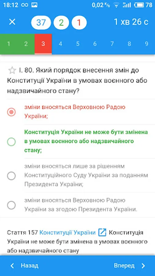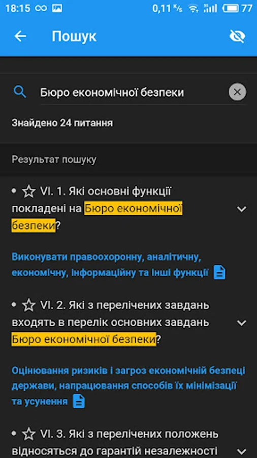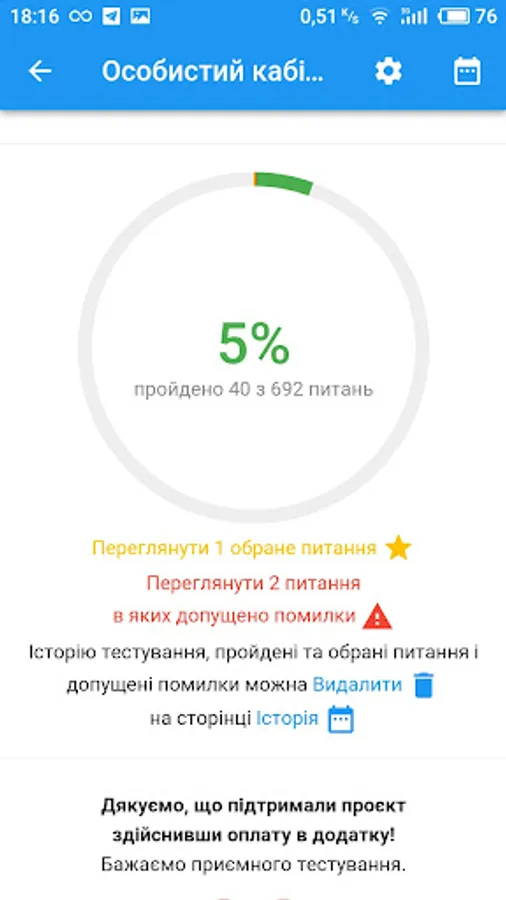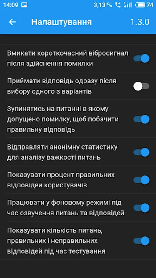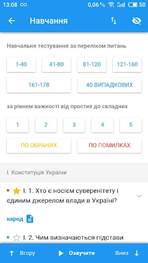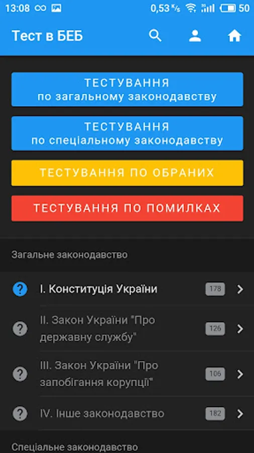 - Testing by questionx of any selected sections: in a row, randomly or by difficulty (determined by the statistics of passing tests by all users of the application);