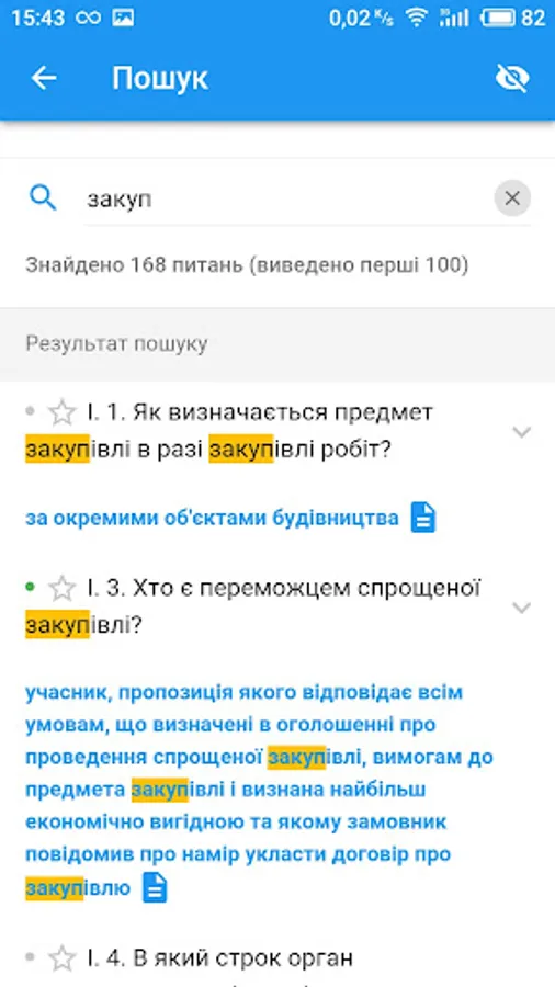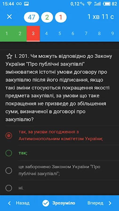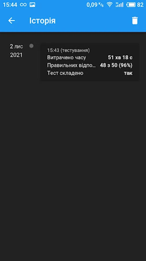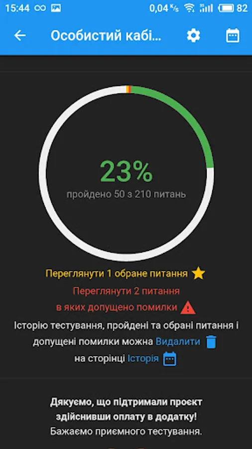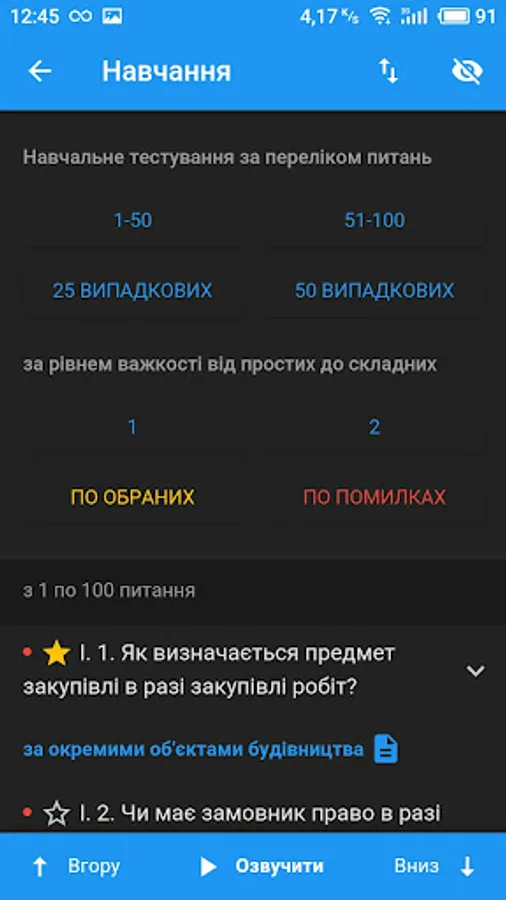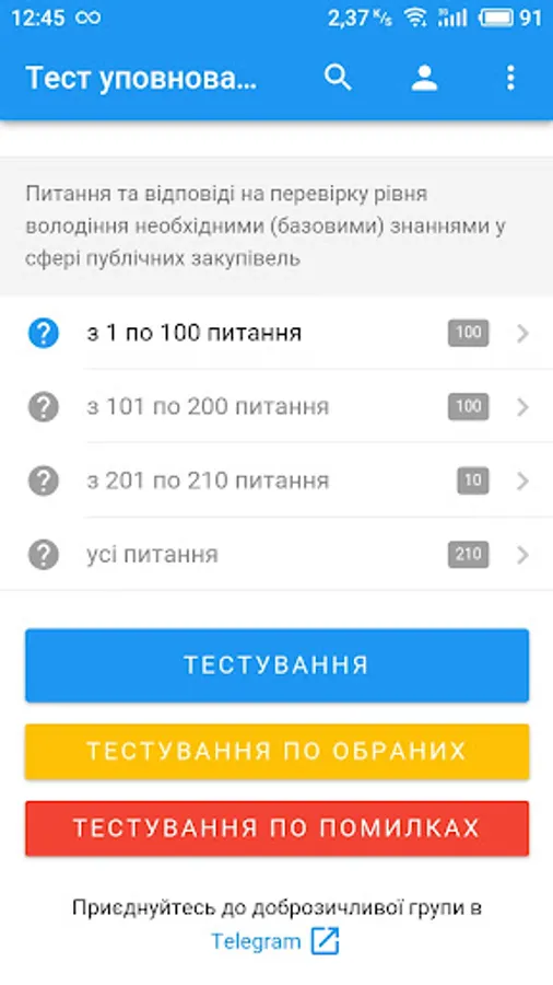 - Testing by question x of any selected sections: in a row, randomly or by difficulty (determined by the statistics of passing tests by all users of the application);