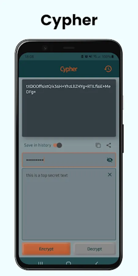 The application will encrypt your private and secret texts with a password-key so you will be sure no one except your receiver will read it. To make Cypher work, encrypt the message in the app, send encrypted texts and share the encrypted text and the key with the recipient. The receiver cannot decrypt your secret massage without the key. This easy and most importantly, secure.