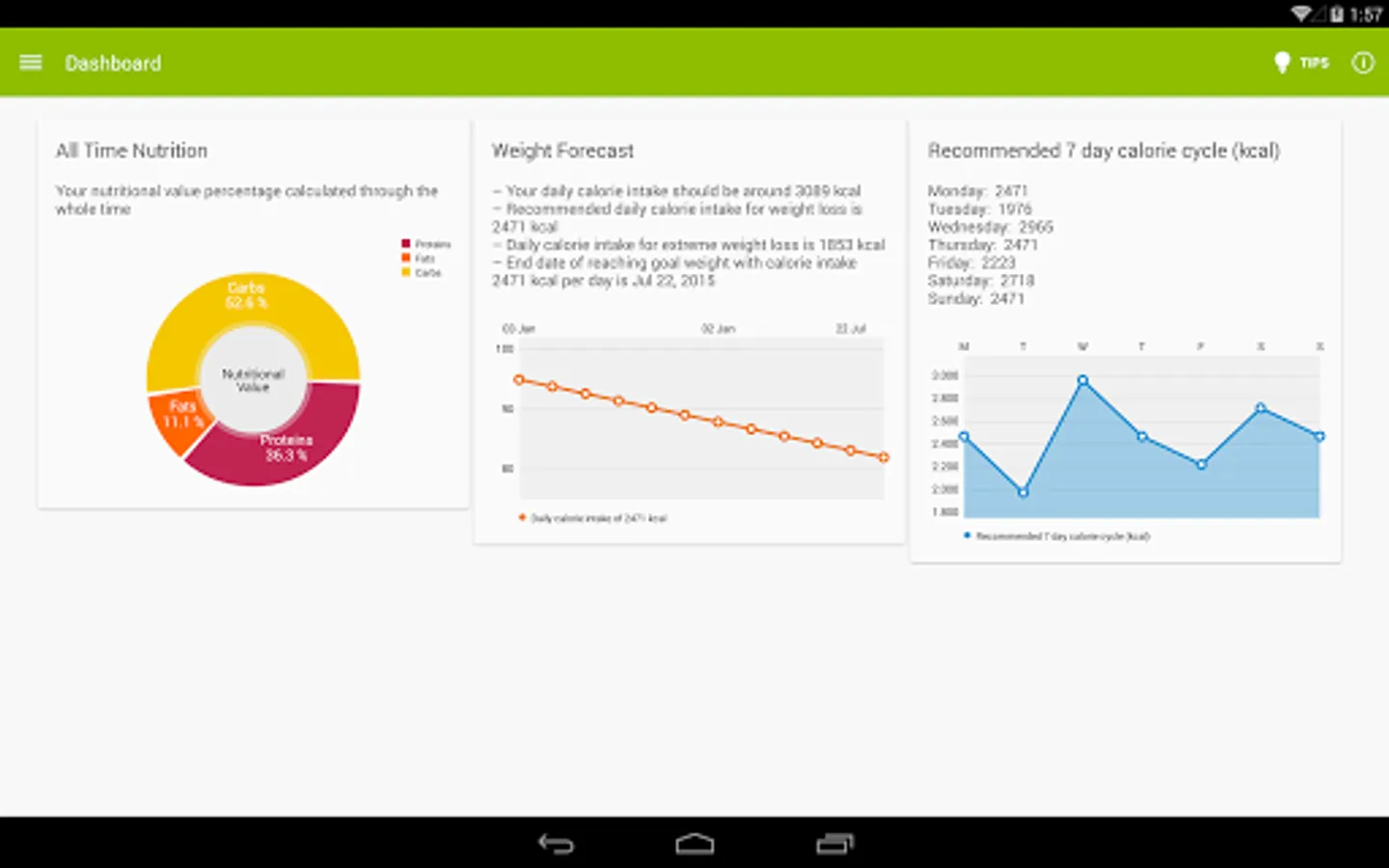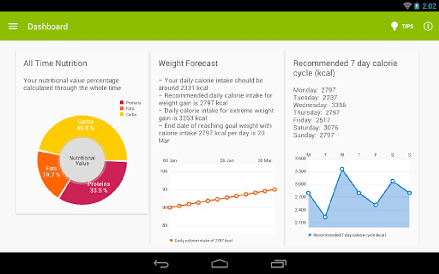 ✓ View of your nutrition status with recommendations and weight forecasts;