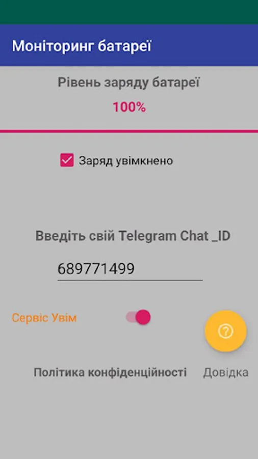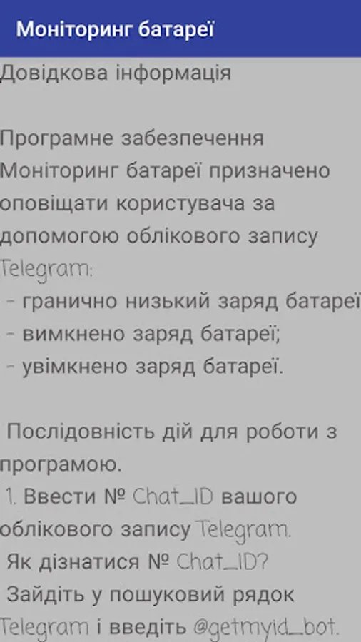 Програмне забезпечення Моніторинг батареї призначено оповіщати користувача за допомогою облікового запису Telegram: