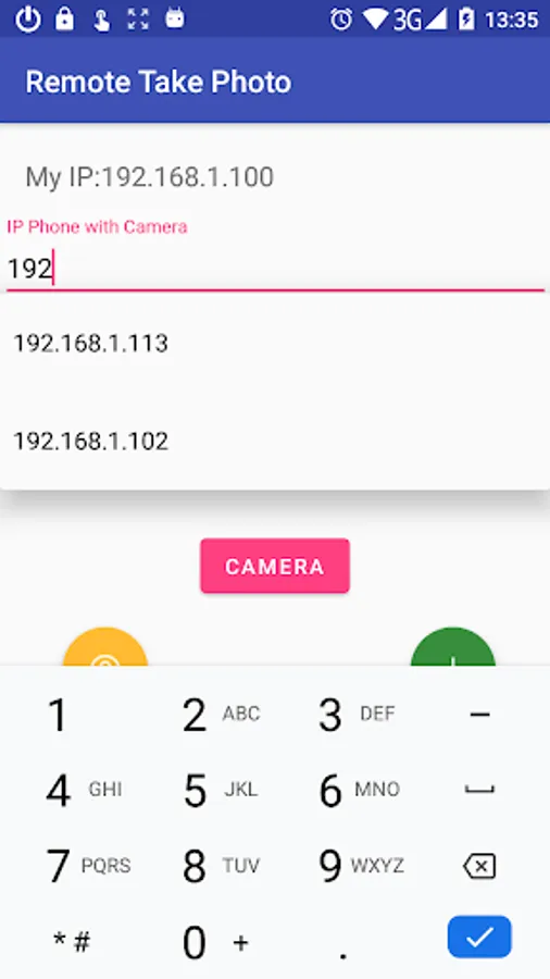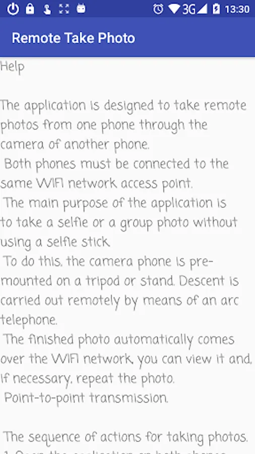 The application is designed to take remote photos from one phone through the camera of another phone.Both phones must be connected to the same WIFI network access point. The main purpose of the application is to take a selfie or a group photo without using a selfie stick.To do this, the camera phone is pre-mounted on a tripod or stand. Descent is carried out remotely by means of an arc telephone. The finished photo automatically comes over the WIFI network, you can view it and, if necessary, repeat the photo. Point-to-point transmission.