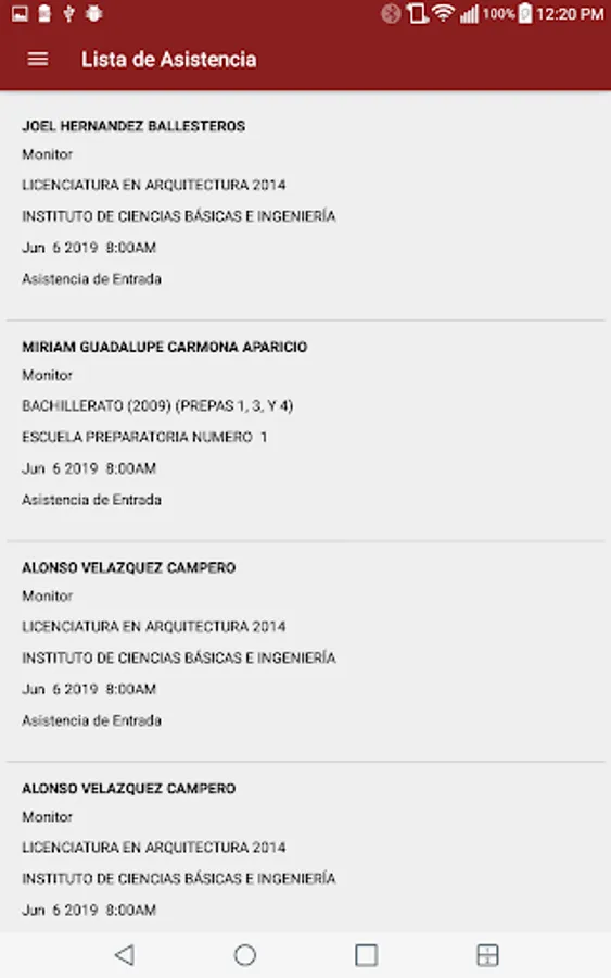 Application for registration of staff attendance during the application of the selection exam for admission to the Autonomous University of the State of Hidalgo.