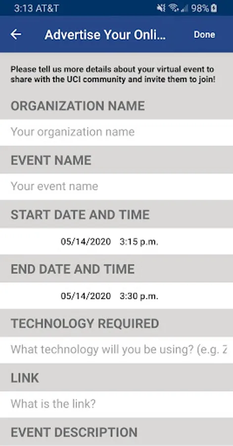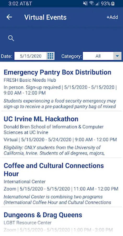 The “Virtual Events” section includes listings of all online UCI events occurring on the web, opportunity drawings, and other activities as a way to stay connected online. Sign in with your UCInetID to submit your own events using the “Add” button, so you can be featured on the event calendar, and on the Student Center Virtual Events homepage.