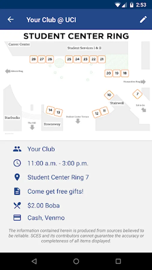 The “Ring Mall” feature includes a real-time list of activities with helpful maps. The list of activities include food sales, fundraisers, exhibits and other activities hosted on Ring Mall and can be sorted by location, organization, time, and type of food sale. Entries are searchable and can be edited by the sponsoring organization to include helpful information such as a description of their organization, their activities, pricing, and payment options.