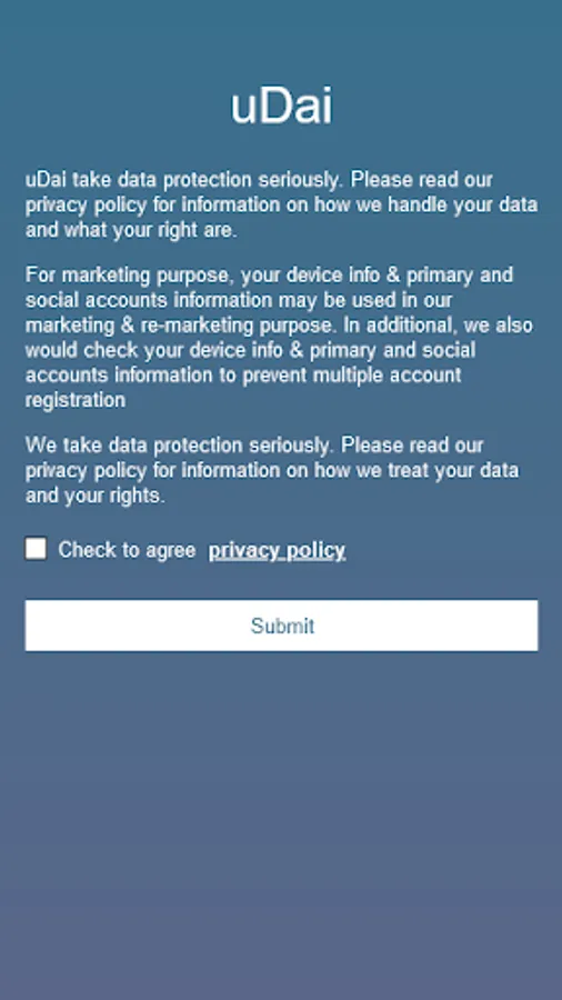 For marketing purpose, your device info & primary and social accounts information may be used in our marketing & re-marketing purpose. In additional, we also would check your device info & primary and social accounts information to prevent multiple account registration