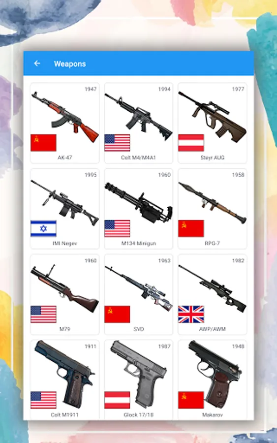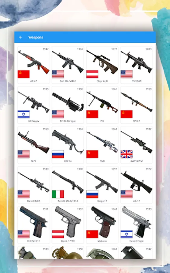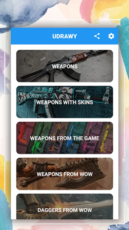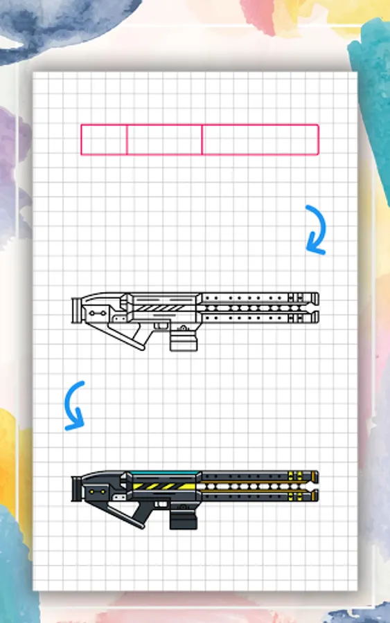 The application contains a huge number of drawing lessons. All of them are arranged by category. Weapons, animals, dinosaurs, food, cute, kawaii drawings, fantastic things and many other categories are presented in the app. Choose what you like best. The number of drawing lessons in the categories is constantly increasing, and their quality is improving. Pistols, grenades, wolves, tigers, snakes, swords, axes and much more are in these categories.