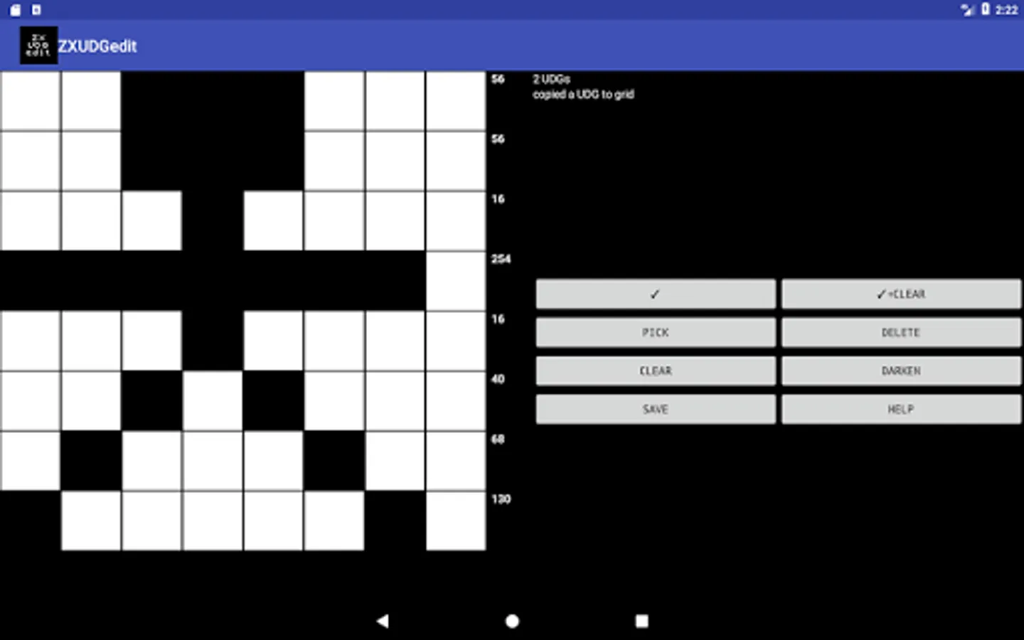 - Allow "scratchpad" viewing of UDGs above/below/side of each other ? Could have a touch drag-and-drop that shows the graphics and allows the user to drag them, placing them adjacently...fairly easy to imagine with just 21 UDGs but could be difficult with hundreds of graphics. Maybe INK/PAPER/BRIGHT attributes too! Although usually it's better to see these running on the Spectrum itself.