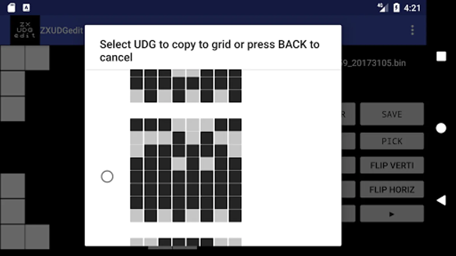 Use the PICK button to edit UDGs in memory, DELETE to select a UDG for deletion and SAVE to save the graphics to a binary file.