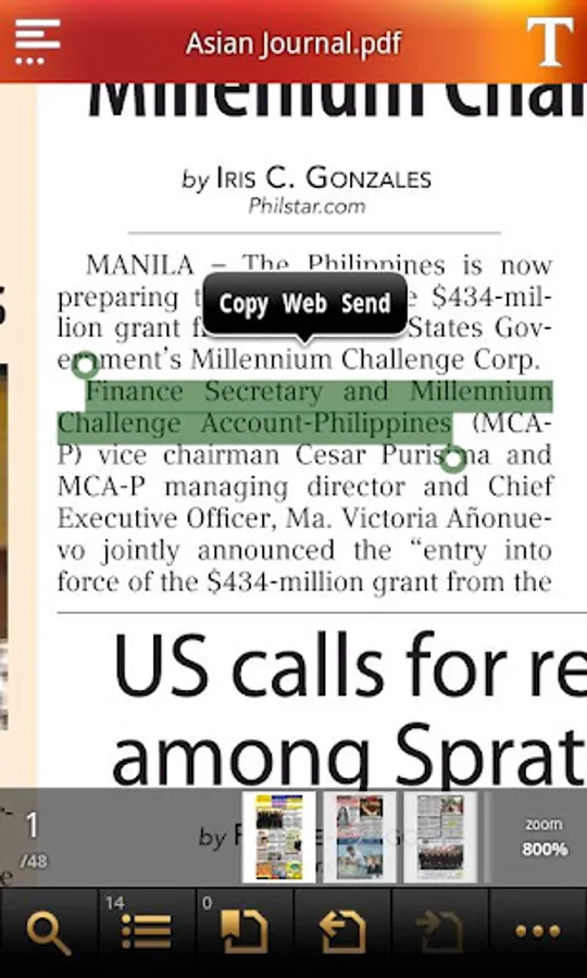 - Able to select text in PDF, save to clipboard, web search, share with other apps
