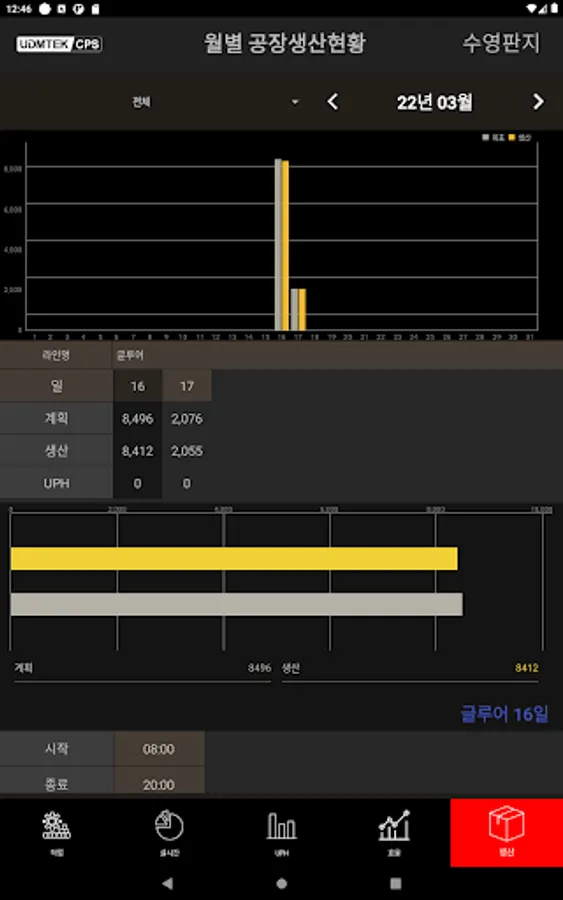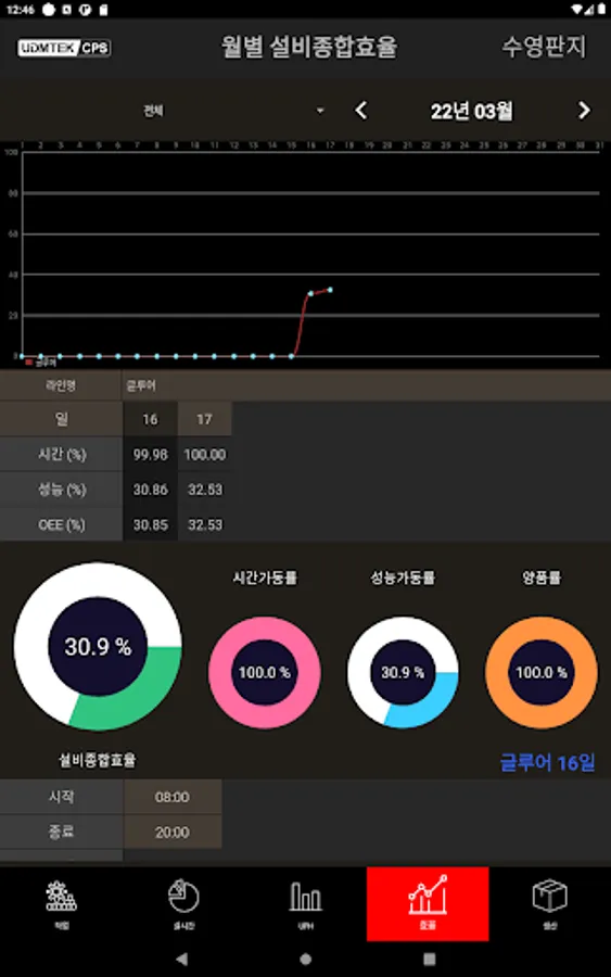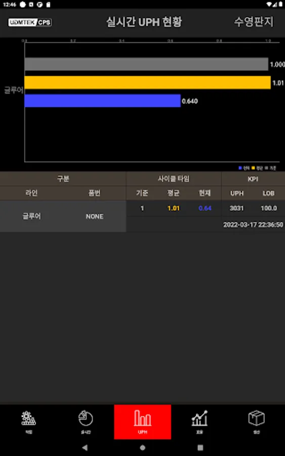 As a mobile application constituting the UDMTEK Smart Factory CPS platform, it provides real-time production/operation status, UPH, production efficiency, non-operation information, etc.