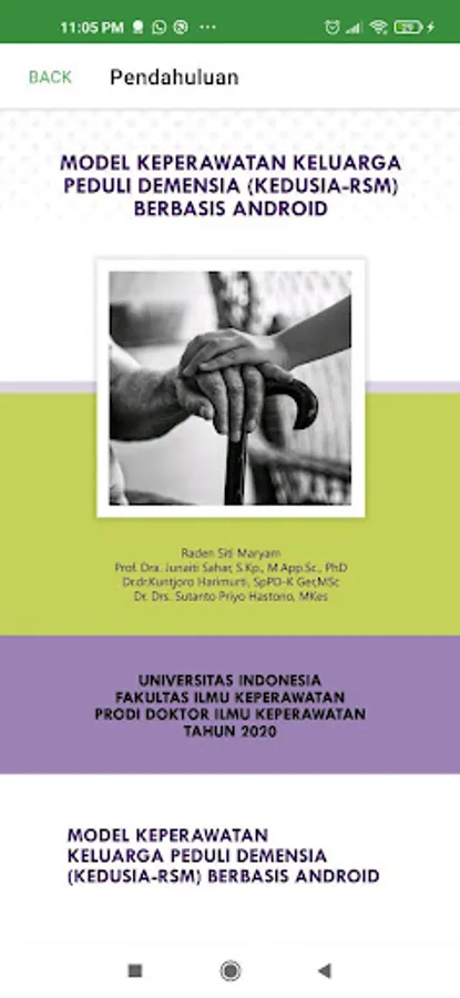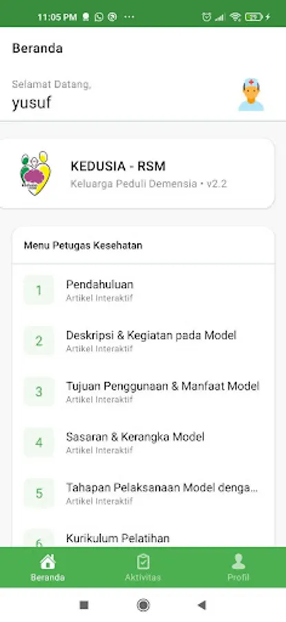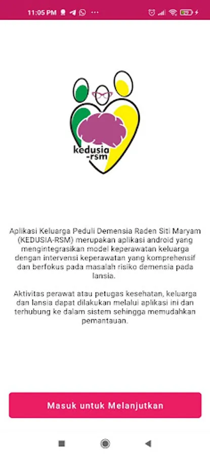 The Family Care Application for Dementia Raden Siti Maryam (KEDUSIA-RSM) is an android application that integrates a family nursing model with comprehensive nursing interventions and focuses on the problem of dementia risk in the elderly. The activities of nurses or health workers, families and the elderly can be carried out through this application and connected to the system so as to facilitate monitoring.