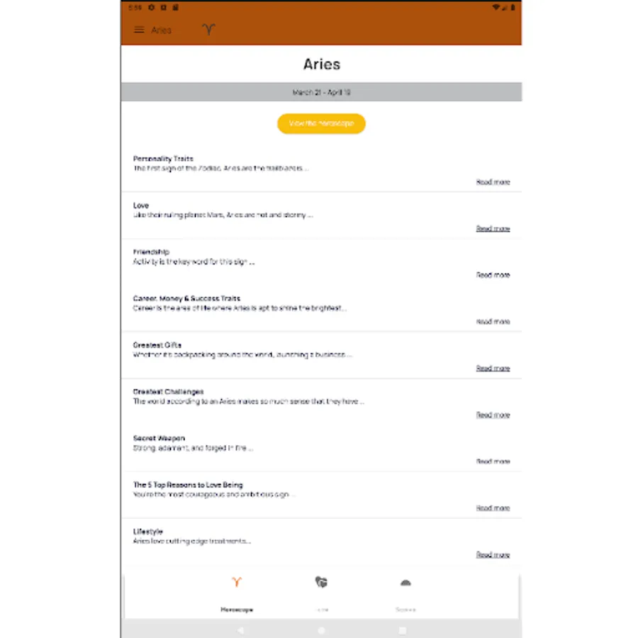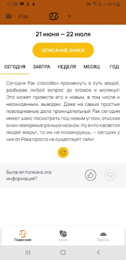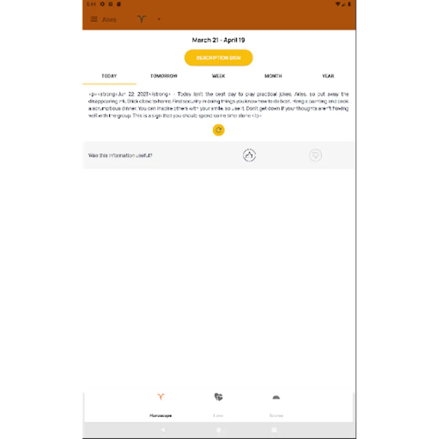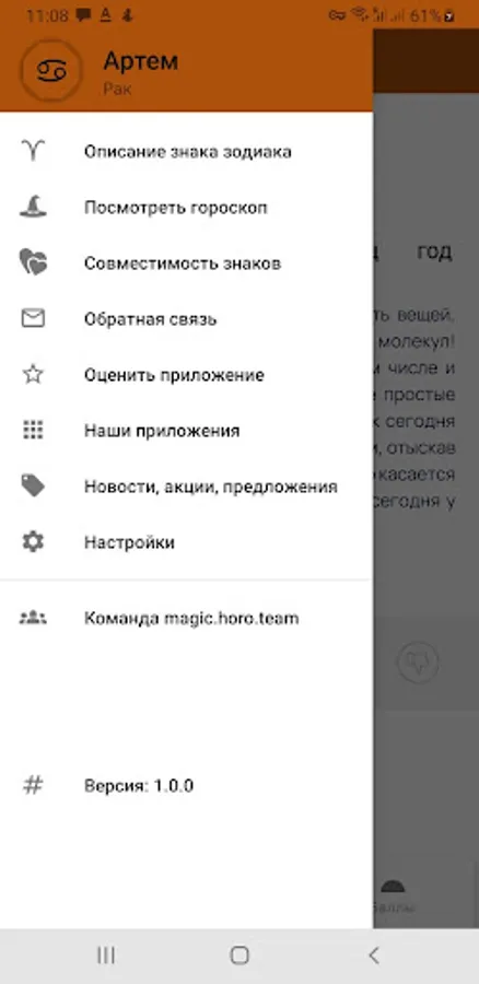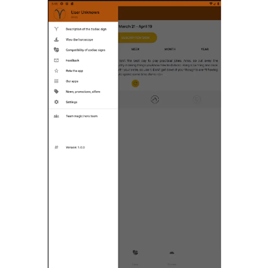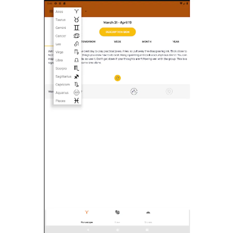 Приложение позволяет выбрать знак зодиака и узнать, что советуют сегодня звезды для Вас и ознакомиться с рекомендациями на текущий день, также можно получить описание любого знака зодиака, узнать совместимость знаков зодиака для дружбы, отношений,. создание семьи, партнерства и бизнес отношений. Можно выбрать гороскоп на английском и русском языках.