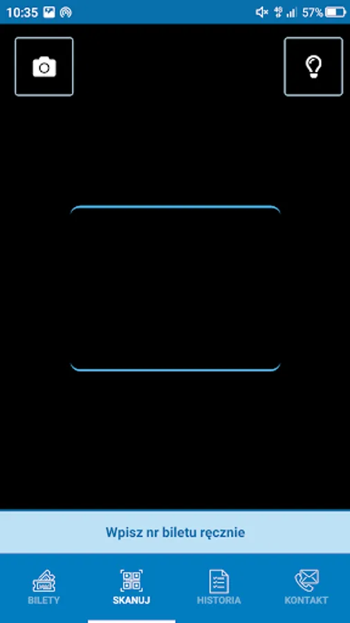 The application allows you to scan QR codes. To start scanning tickets, press the "camera" icon, then aim the camera at the ticket code. If you need it, you can sharpen the image manually by pressing the screen. If there are any problems with scanning, try changing the distance of the camera from the ticket, or sharpen the image manually.