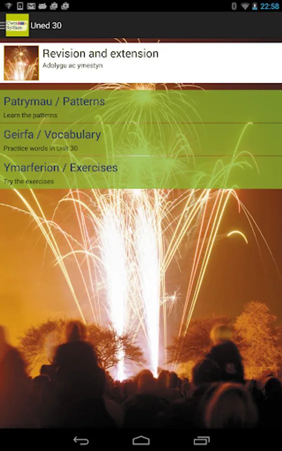 Please note: This course follows on from Cwrs Mynediad - entry level. If you are just starting Welsh, Cwrs Mynediad teaches pronunciation and gives a basic level of conversational Welsh. The Cwrs Mynediad App will be coming soon.