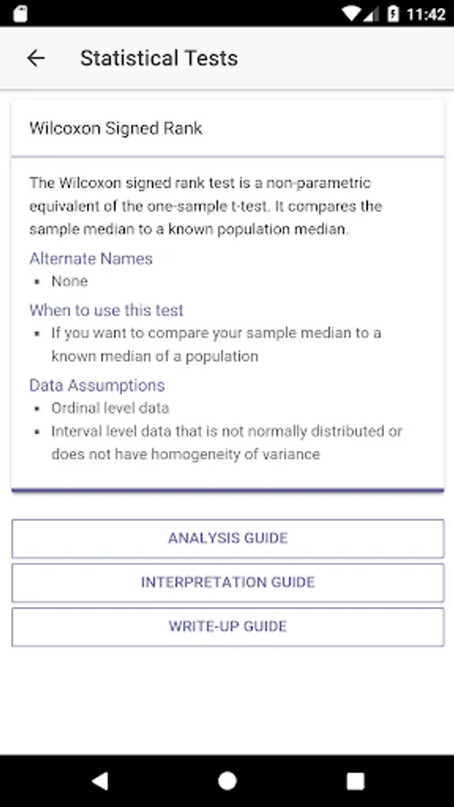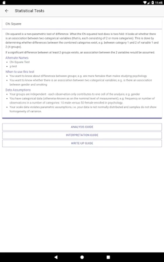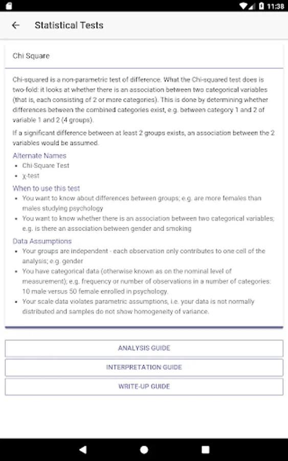 The main feature is the decision tree, this allows users to answer a series of questions about their data and discover the most appropriate test. Each test covered features a basic overview plus guides, using a practical example, on how to input data and run the analysis, what to look for in the output (interpretation) and an example write-up.