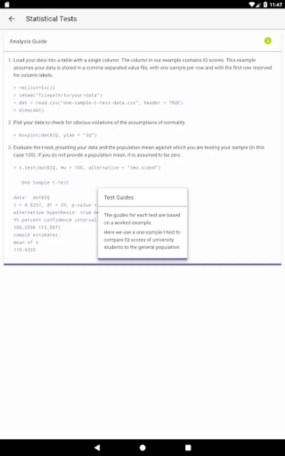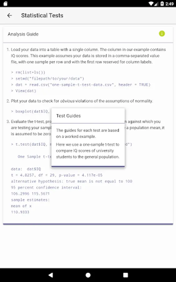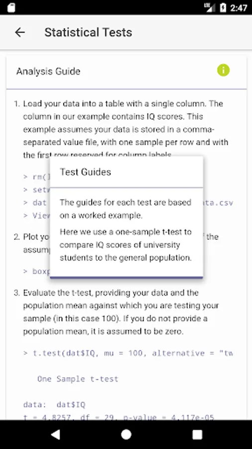 StatsGuru for R is aimed at students learning about statistics and contains information on a comprehensive list of typical statistical tests that college or university level students may be expected to know.