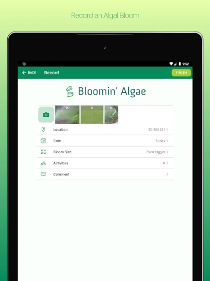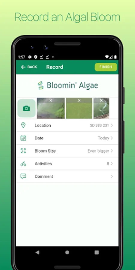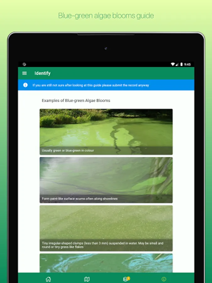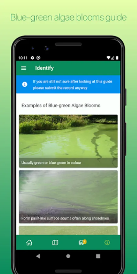 Both the Environment Agency (EA) and the Scottish Environment Protection Agency (SEPA) provide a blue-green algae analytical service and advice to local authorities, water body owners, managers etc. However there is no routine national algal bloom monitoring system, and so records of past bloom events are patchy. By recording blue-green algal blooms through this app, we hope to get a better overall picture of the timing and location of algal blooms across the UK, to help inform local authorities and relevant health agencies of potential public health risks and aid the EA & SEPA in bloom management and prevention in the future.