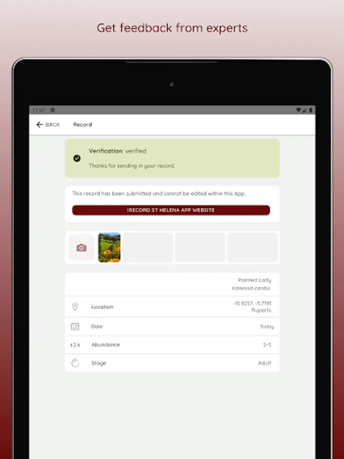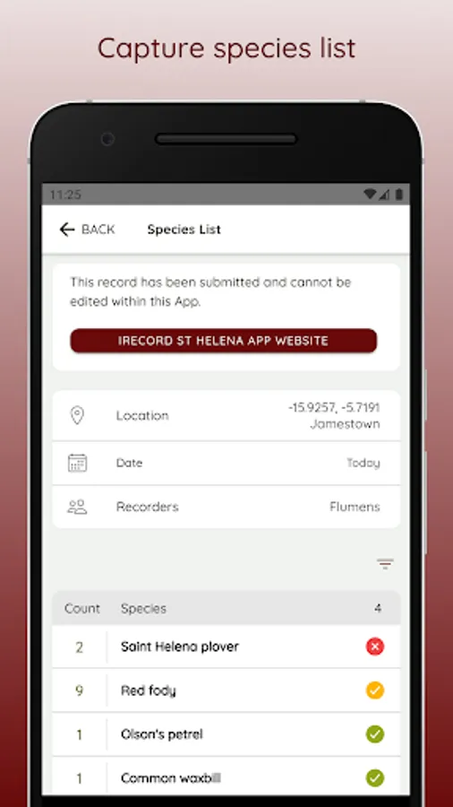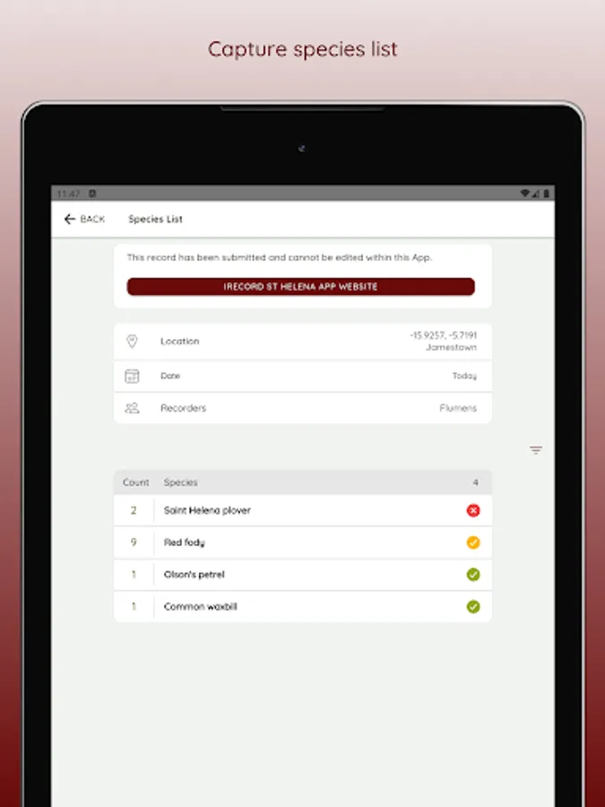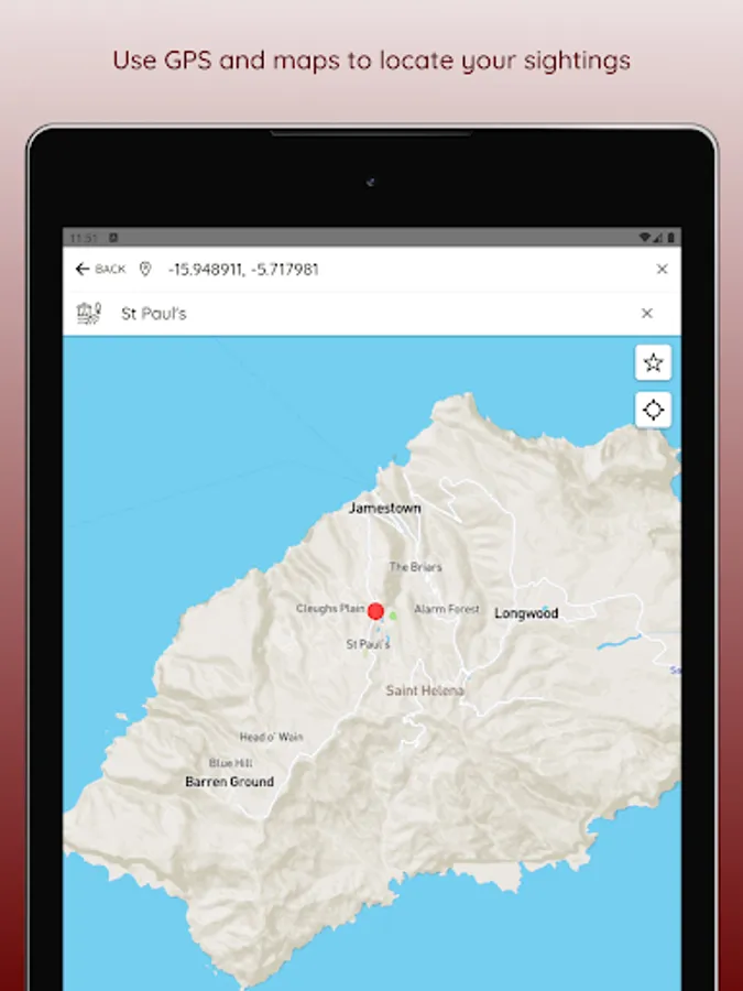 iRecord St Helena App enables you to get involved with biological recording. Contribute your species sightings with GPS acquired coordinates, descriptions and other information, thus providing scientists with important new biodiversity information that contributes to nature conservation, planning, research and education.