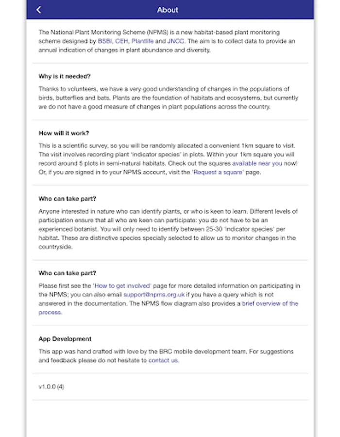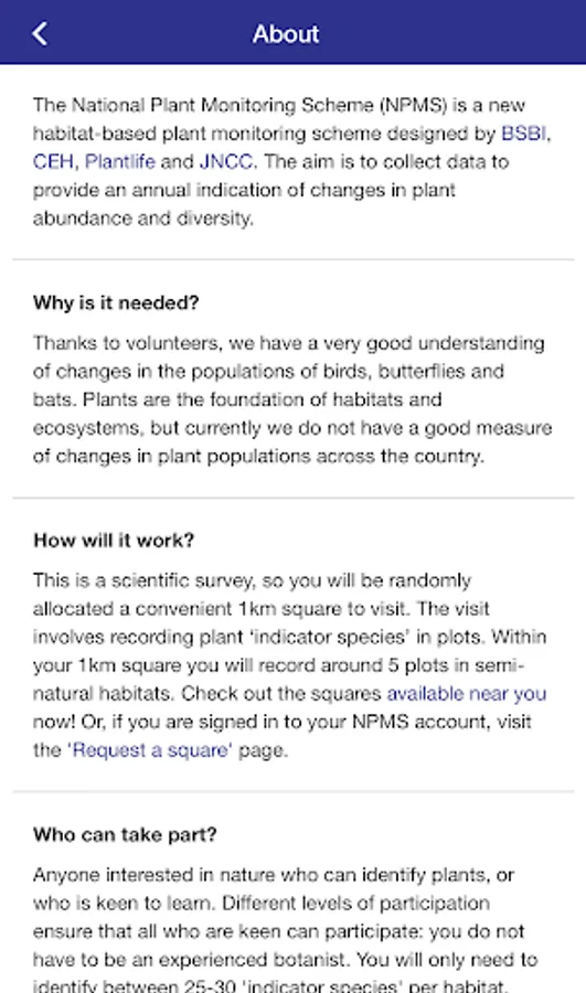 The National Plant Monitoring Scheme (NPMS) is a new habitat-based plant monitoring scheme designed by BSBI, CEH, Plantlife and JNCC. The aim is to collect data to provide an annual indication of changes in plant abundance and diversity.