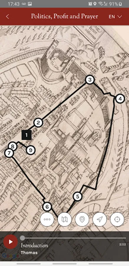 Finden Sie Ihre Wege in der Stadt mithilfe einer aktuellen Stadtkarte und einer Stadtkarte des Jahres 1587.