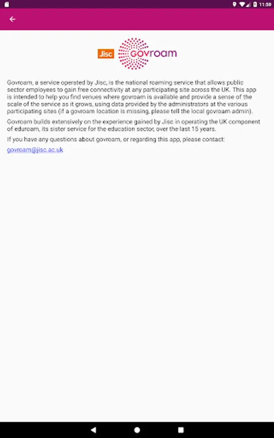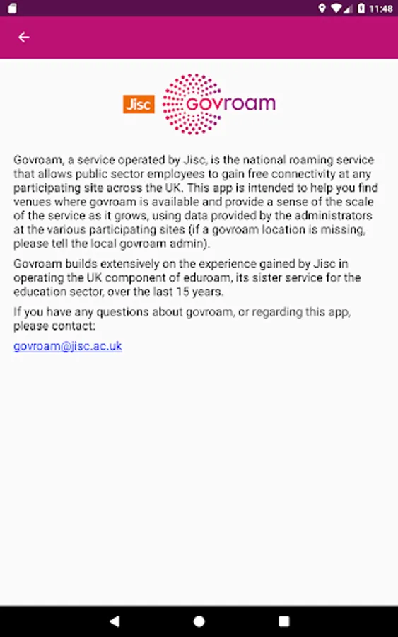 The app helps users find venues that offer govroam connectivity that is appropriate for their use (i.e. a health worker can filter results to display only NHS venues), and provides an overview of the scope of the national govroam federation as it grows. The data it displays is added by the technical administrators of govroam at the various participating organisations. If your local govroam instance is not represented, please contact your admin to ask them to update the app database via Jisc.