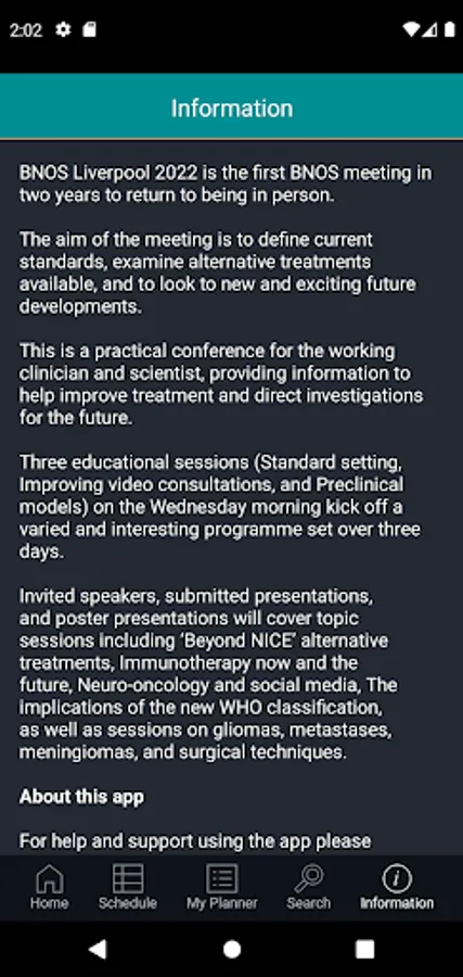 This app is for attendees of the British Neuro-Oncology Society Annual Meeting 2022. The app provides a range of features to enhance the attendee's experience, including the ability to create a personalised itinerary.
